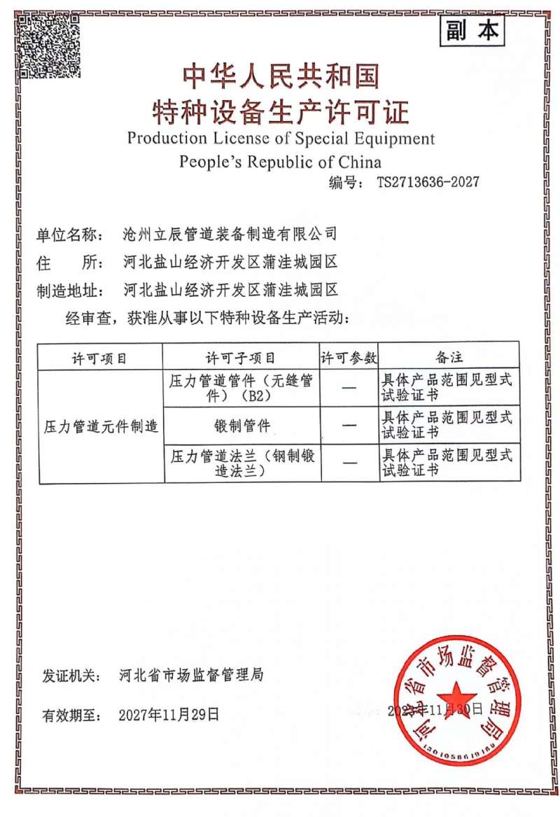 滄州立辰管道裝備制造有限公司是一家制造、銷售為一體的加工企業(yè),公司已通過特